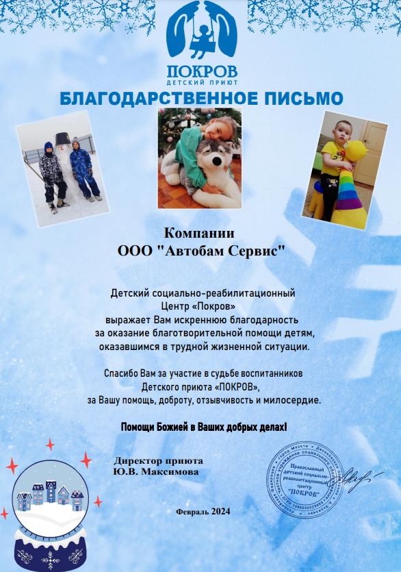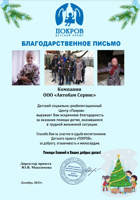 Обращение от Детского приюта «ПОКРОВ» к руководителю и коллективу «BS-Tyres» (от декабря 2023 г)